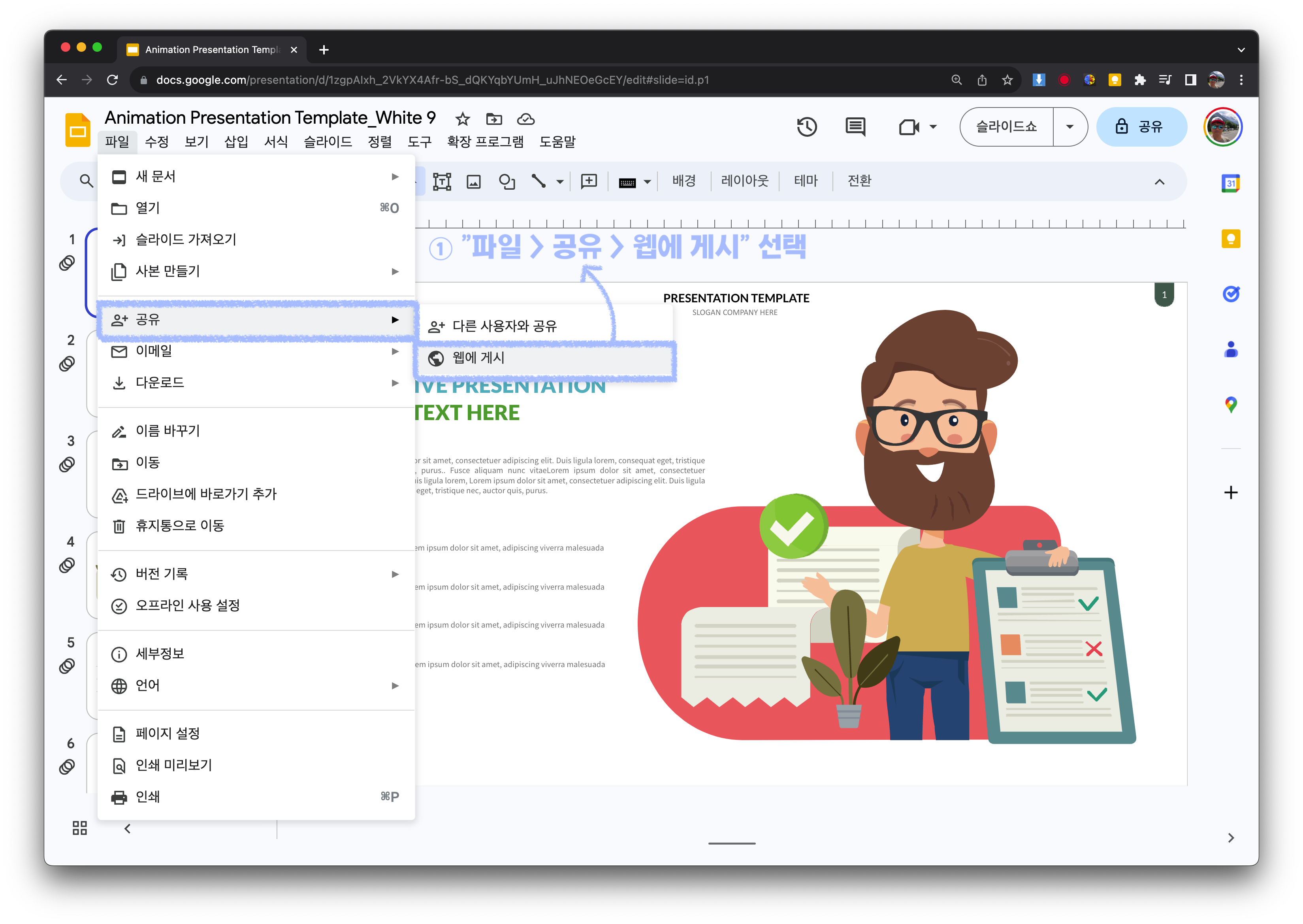 1. 구글 프리젠테이션 문서에서 파일 > 공유 > 웹에 게시 선택